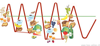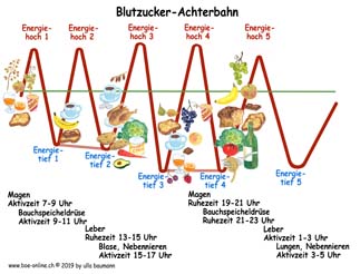 Zucker, Süssigkeiten, auch reine Pflanzenkost ohne Fett (Getreide/Gemüse, Früchte) führen vor allem morgens zu einem raschen Anstieg des Blutzuckerspiegels, als Reaktion wird zu viel Insulin ausgeschüttet und als Gegenreaktion Hormone, welche den Blutzuckerspiegel wieder erhöhen (Stresshormone der Nebennieren und der Schilddrüse). Eine tägliche Blutzuckerachterbahn führt zur Überbelastung und Erschöpfung der Hormondrüsen (auch der Bauchspeicheldrüse), je nach Neigung zu Gelenk- Haut- Schleimhautproblemen, rheumatische Beschwerden.