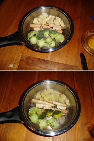 Die richtige Temperatur ist erreicht, wenn das Gemüse aufgewärmt ist (man hört es zischen).