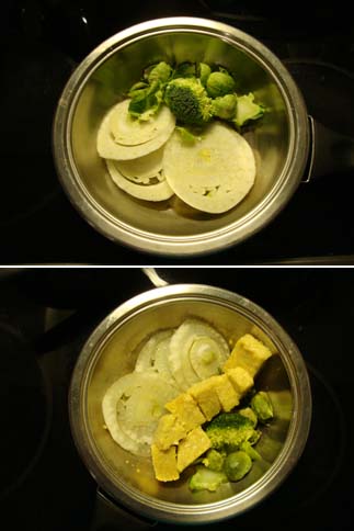 Sie können verschiedene Gemüsesorten im selben Topf schön anordnen, so wie Sie es später servieren möchten.