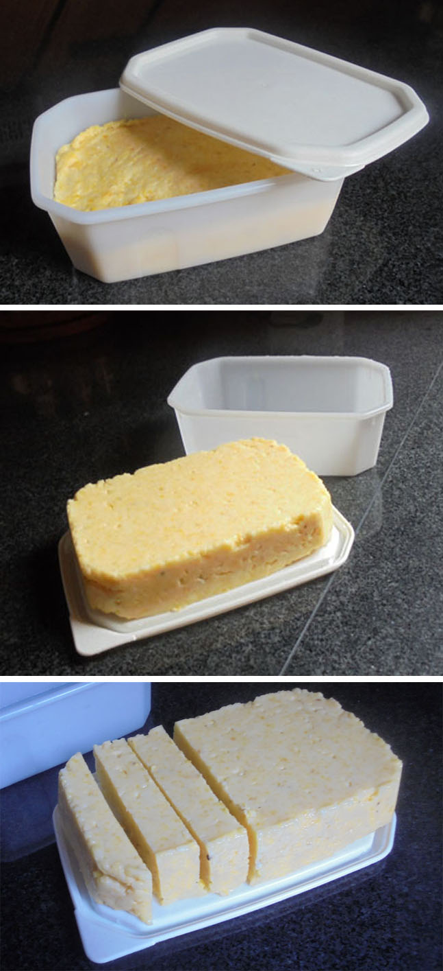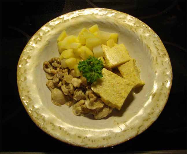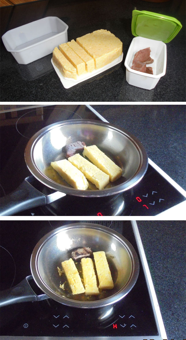 Die Polenta kann dann in Streifen oder Würfel geschnitten werden. Sie lässt sich braten oder mit dem gegarten Gemüse erwärmen, sie kann als Einlage in Suppen verwendet werden.