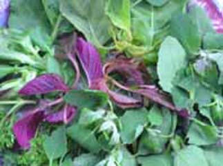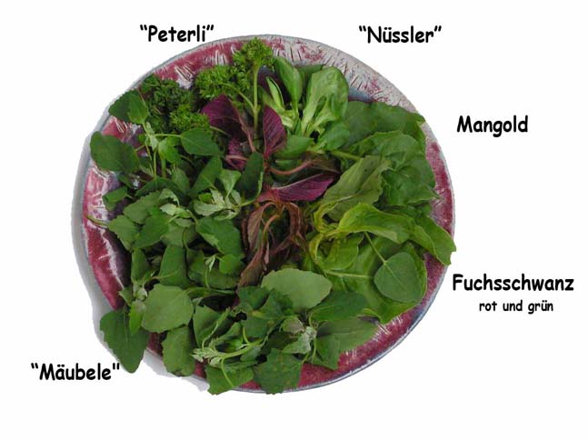 Melde oder gemeiner Gänsefuss oder "Mäubele" (verwandt mit dem südamerikanischen Quinoa) und roter und weisser Amarant oder "Fuchsschwanz" (verwandt mit dem südamerikanischen Amaranth).
